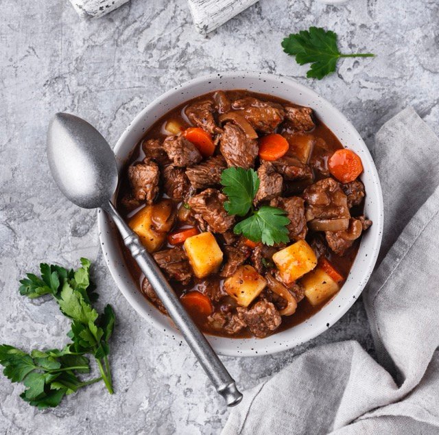Bœuf braisé, carottes, oignons, bouquet garni, vin blanc, bouillon naturel de bœuf.