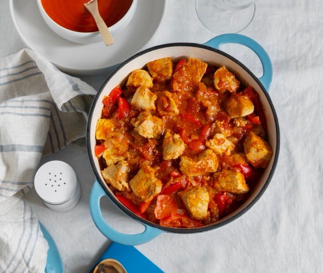 Poulet, trio de poivrons, riz, pommes de terre ou haricots verts.