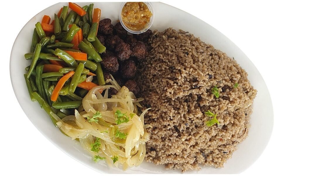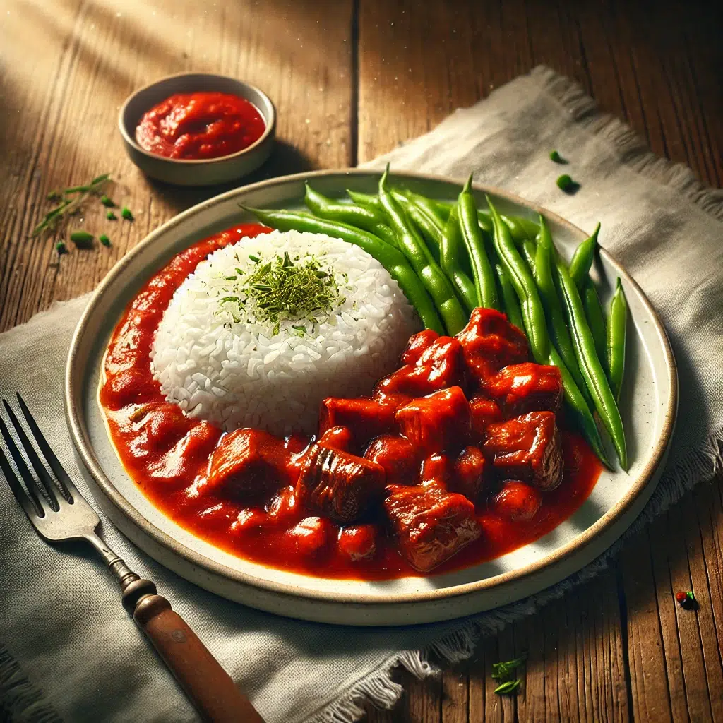 Alloco, riz, haricots verts, sauce tomate avec dés de bœuf marinés.