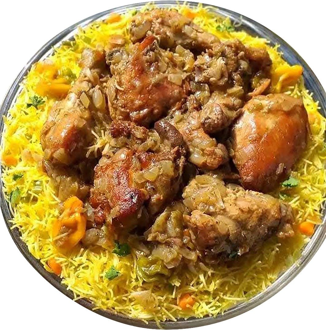 Poulet mariné au citron et moutarde, accompagné de riz.